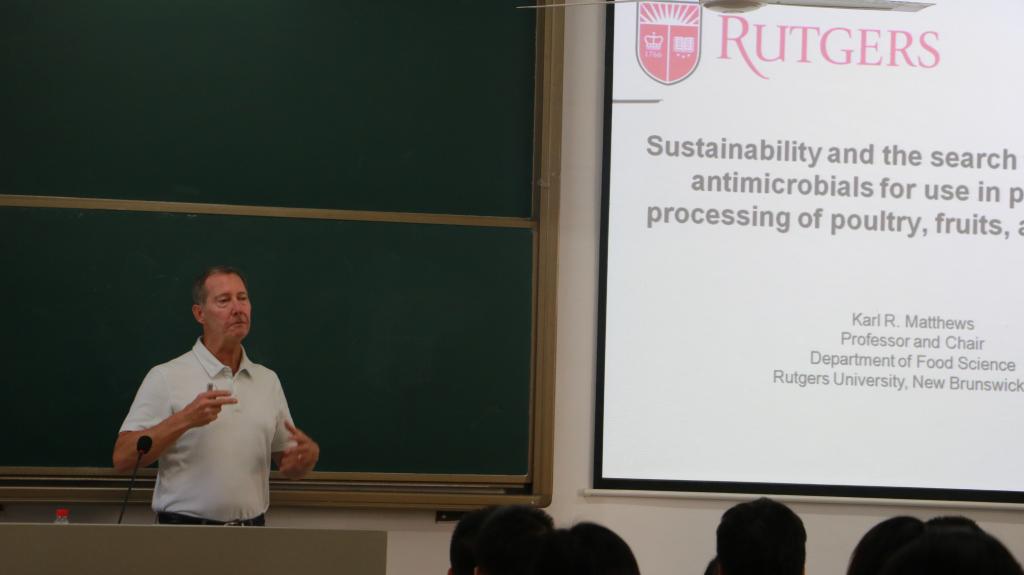 核心提示:10月9日上午,来自罗格斯大学(Rutgers University)Karl R.Matthewes教授受邀来我院进行学术交流并进行了主题为“Sustainability and the search for novel water antimicrobials for use in post-harvest processing of poultry, fruits, and vegetables的报告,吸引了众多师生前来聆听。