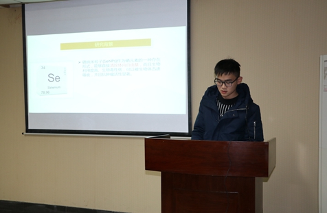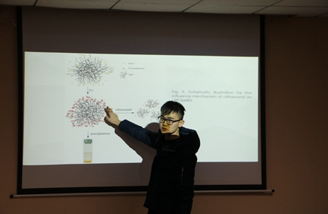 本次报告中,蔡文斐首先向到场的师生们介绍了虎乳灵芝多糖(LRP)与硒纳米粒子(SeNPs)的研究背景。随后,他又详细地向大家讲述了汇报的主要内容,包括超声辅助下虎乳灵芝多糖硒纳米粒子的制备;超声辅助下虎乳灵芝多糖硒纳米粒子的紫外、红外、纳米粒度仪、透射电镜、X射线能谱等一系列结构表征以及该复合物对于ABTS自由基和DPPH自由基的清除率。同时,通过视频和文字结合方式,对超声空化效应的原理和应用进行了阐释说明,将单一的汇报变动生动有趣。最后对研究内容进行小结:超声使LRP紧密线圈结构解缠结,使U-LRP成为合适的载体,SeNPs更加容易进入并稳定在U-LRP;超声处理使复合物具有更小粒径和更佳稳定性;同时超声处理提高LRP-SeNPs对DPPH、ABTS自由基的清除率。