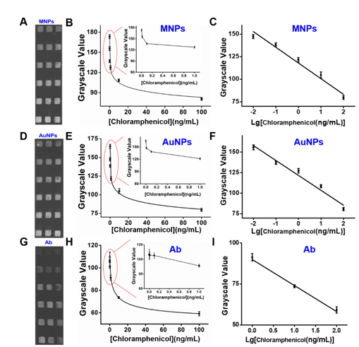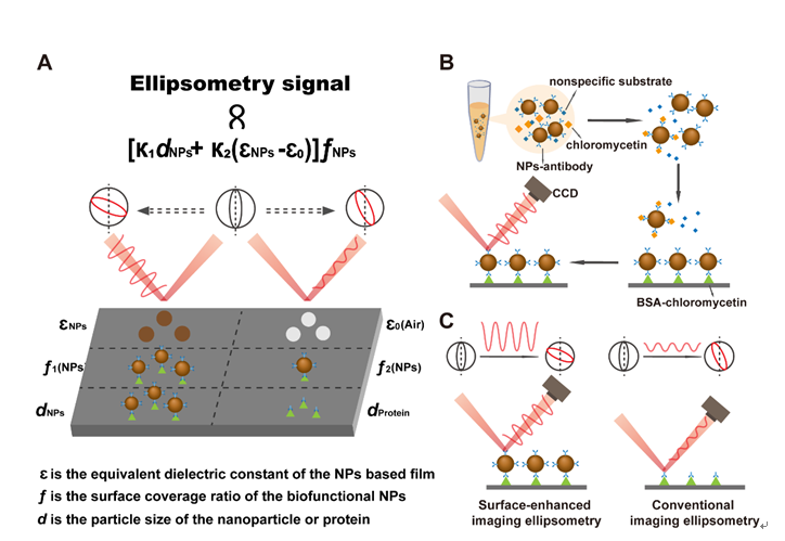 抗生素残留超标一直是制约我国乳品行业发展的主要问题之一。其中氯霉素作为一种高效的抑菌性广谱抗生素,被用于养殖业中以预防奶牛的感染。然而,氯霉素在牛奶中的残留却存在极大的潜在危害。人体摄入氯霉素对骨髓造血机能有抑制作用,可引起粒细胞缺乏病、再生障碍性贫血和溶血性贫血,严重者可产生致死效应。而且,人体对氯霉素较动物更敏感,婴幼儿的代谢和排泄机能尚不完善,对氯霉素最敏感,可出现致命的“灰婴综合征”。因此,食品安全国家标准中明确规定乳品中不得检出氯霉素。这就需要有满足现实需求检测方法的开发。基于此需求,陈翊平教授课题组构建了基于纳米颗粒表面增强椭圆偏振成像生物传感器(Surface-enhanced imaging ellipsometry biosensor, SEIE-biosensor),实现了对牛奶中氯霉素残留超灵敏、便捷快速的检测,并且从理论上探讨了纳米颗粒使椭偏信号增强的机理。