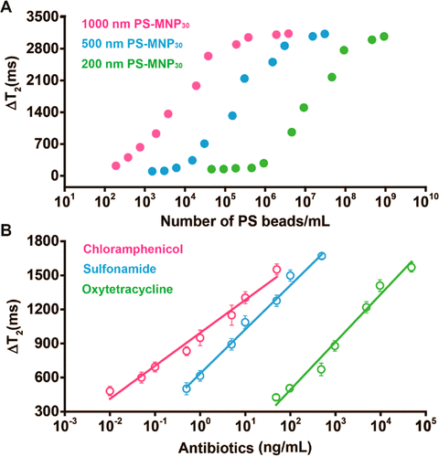 基于上述问题,陈翊平教授课题组构建了一种能够线性可调检测食品基质中多种抗生素残留的磁纳米免疫传感器。通过点击反应在不同粒径的聚苯乙烯微球(Polystyrene beads,PS)上面组装纳米磁颗粒,因为不同粒径的PS微球表面偶联的纳米磁颗粒的数量不同,因此可以制备不同磁信号强度的磁探针,从而实现线性范围的大幅度调节(pg/mL-μg/mL),具有检测浓度范围跨度大的特点。针对不同目标物的浓度不同,选择不同的磁信号探针,进行可以实现浓度范围不同的多种抗生素残留的检测。