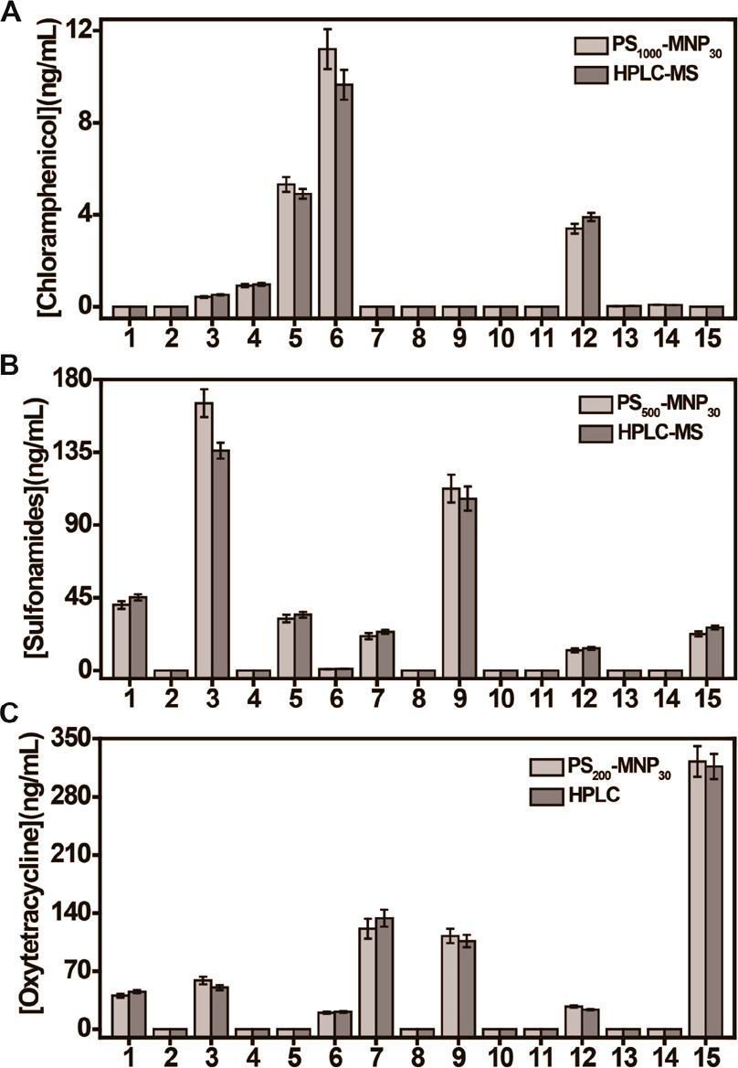 本工作首先对MNP1000, MNP30, PS1000, PS1000-MNP30在0.01T的磁分离性能进行了比较,发现仅MNP1000能在短时间内分离完全,且磁信号发生显著变化(图2 A, B)。然后通过TEM和DLS对合成的PS-MNP30进行了表征,发现偶联前后,粒径发生了显著的变化(图2C-H)。此外,通过研究T2值与PS-MNP30偶联物的关系,证明了粒径大的PS微球能够偶联更多的MNP30,这是本方法定量检测及线性分析的基础(图3 A)。在此基础上,本工作构建了磁弛豫时间免疫传感器(MRS),通过不同的PS-MNP30磁探针对三种常见的抗生素进行了定量检测,均具有良好的线性关系,实现了线性可调检测(图3 B)。最后,我们对实际样品进行了检测,并与HPLC-MS进行了方法学比对(图4),结果表明,本传感器在抗生素残留检测方面具有良好的准确性。