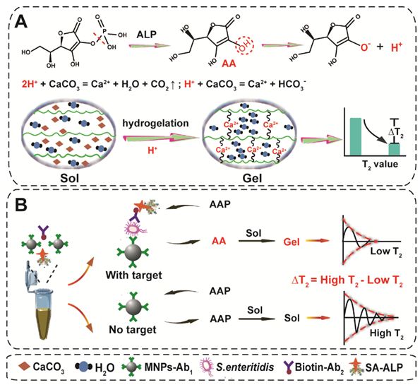 基于此需求,陈翊平教授课题组构建了一种酶介导的水凝胶状态的转变,从而直接改变水分子弛豫行为的生物传感策略,并将其应用于沙门氏菌的灵敏检测。本研究中,研究人员利用免疫中常用的标记酶碱性磷酸酶来水解底物产生酸性环境,从而将碳酸钙中的Ca2+释放出来,诱导海藻酸钠形成“egg-box”结构的水凝胶,而这种凝胶化过程可直接调节水分子的扩散速率,从而引起横向弛豫时间(T2)发生改变(图1)。