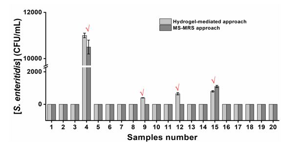 研究人员对酶介导的水凝胶Sol-Gel转变从而直接引起水分子横向弛豫时间的变化进行了MRI,SEM及流变学表征(图2),研究了传感器对AA和ALP的响应(图3),并应用该传感器对食源性致病菌(沙门氏菌)进行了定量检测(图4)以及牛奶实际样品的检测(图5)。结果表明,该传感器在食源性致病菌检测方面具有良好的性能,可在2h实现50 CFU/mL 沙门氏菌的检测,与基于磁分离的磁弛豫时间传感器(MS-MRS)及基于磁颗粒的磁弛豫时间传感器(MNP-MRS)相比,该传感器具有更好的灵敏度和准确性(图5)。