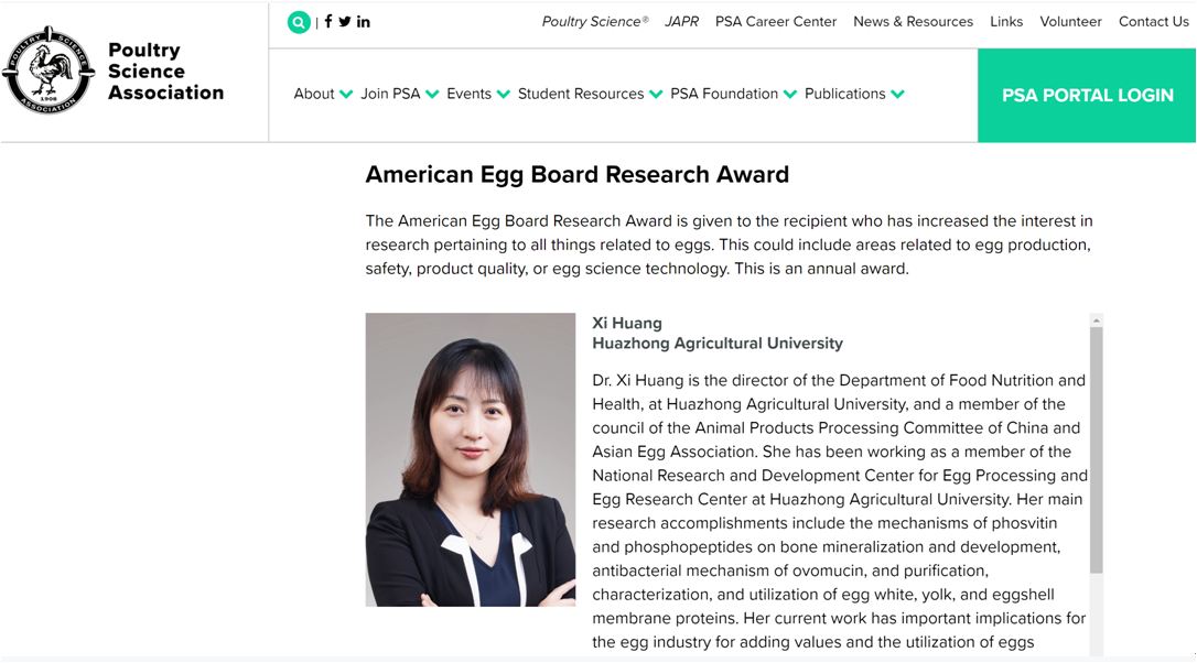 近日,从美国家禽科学协会(Poultry Science Association PSA)获悉,我校英国365上市集团黄茜副教授获得PSA的2021年度禽蛋研究奖(American Egg Board Research Award),以表彰她在禽蛋蛋白质联合提取、结构功能及活性成分高值化利用方面取得的研究成果。