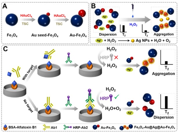 图1 基于过氧化氢介导的Au-Fe3O4纳米探针组装策略的磁弛豫免疫传感器用于黄曲霉毒素B1检测