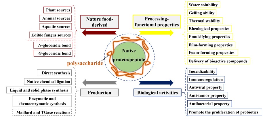 研究背景:蛋白质/多肽和糖类是自然界中两种生物活性物质。近年来,蛋白质/多肽与糖类之间的共价相互作用越来越受到人们的重视。通过蛋白质/多肽与糖类的共价结合得到的产物具有更优异的功能特性,如更好的胶凝性能、热稳定性和持水性。此外,食源性蛋白质/多肽-糖类共价化合物(PSCCs)还具有抗菌、抗糖尿病、抗骨质疏松、抗炎、抗癌、免疫调节等生物活性,广泛应用于功能性食品行业。此外,PSCCs可以作为包装或递送材料,以提高生物活性物质的生物利用度,这将拓展食源性蛋白质和糖类资源的开发。