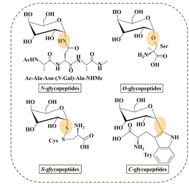 图2 N-、O-、C-、和S-糖肽键的结构特征