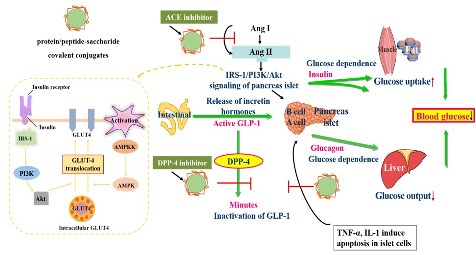图4 蛋白质/多肽-糖类共价化合物的抗糖尿病活性及相关机制
