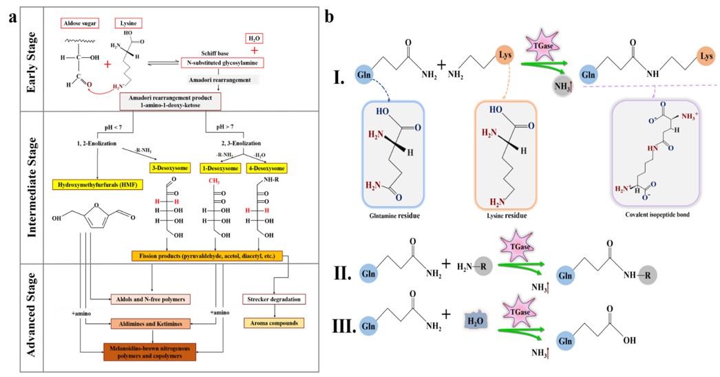 图3 美拉德反应(a)和谷氨酰转移酶催化反应(b)的机制