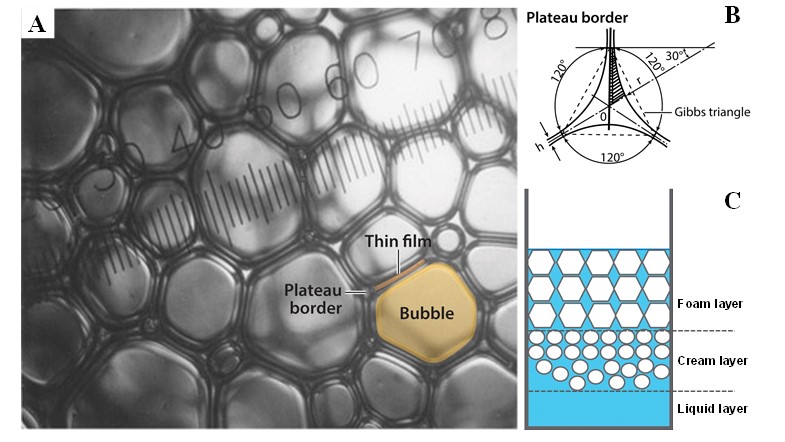 图1(A)泡沫显微镜图片;(B)薄膜相交形成Plateau边界;(C)液体层,膏状层和泡沫层示意图