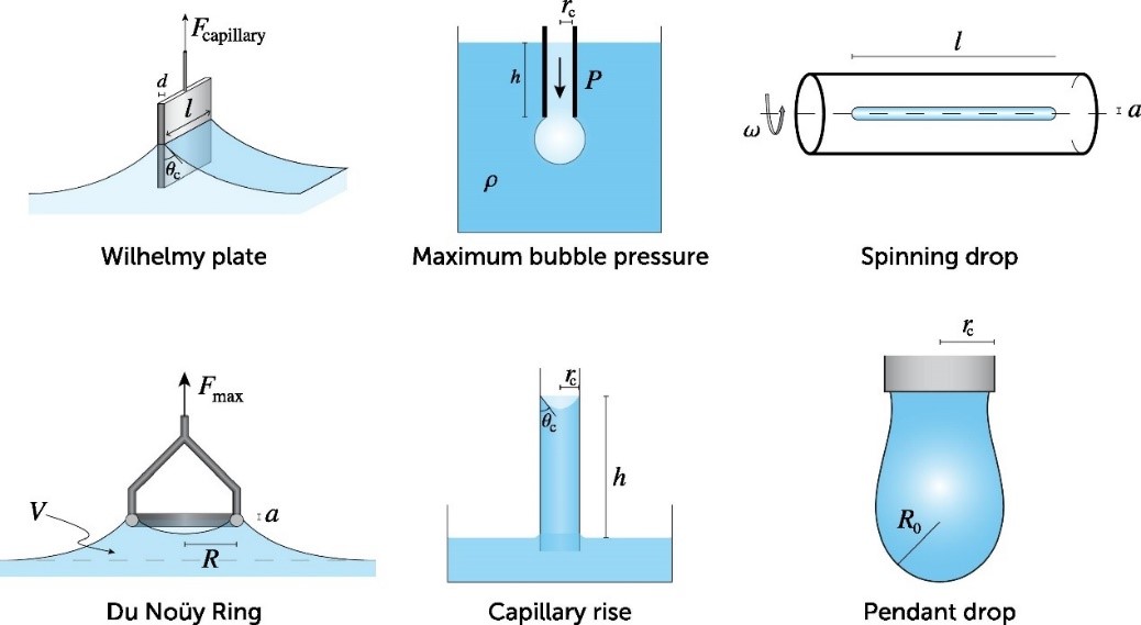 界面张力或表面压力的测量是研究表面活性成分在界面上吸附广泛使用的技术之一。总的来说,界面张力的测定方法包括以下几种:Langmuir法、Wilhelmy平板法和Du Noüy环法等。此外,依赖于Young-Laplace方程的悬滴法也经常用于表面活性成分吸附的研究。
