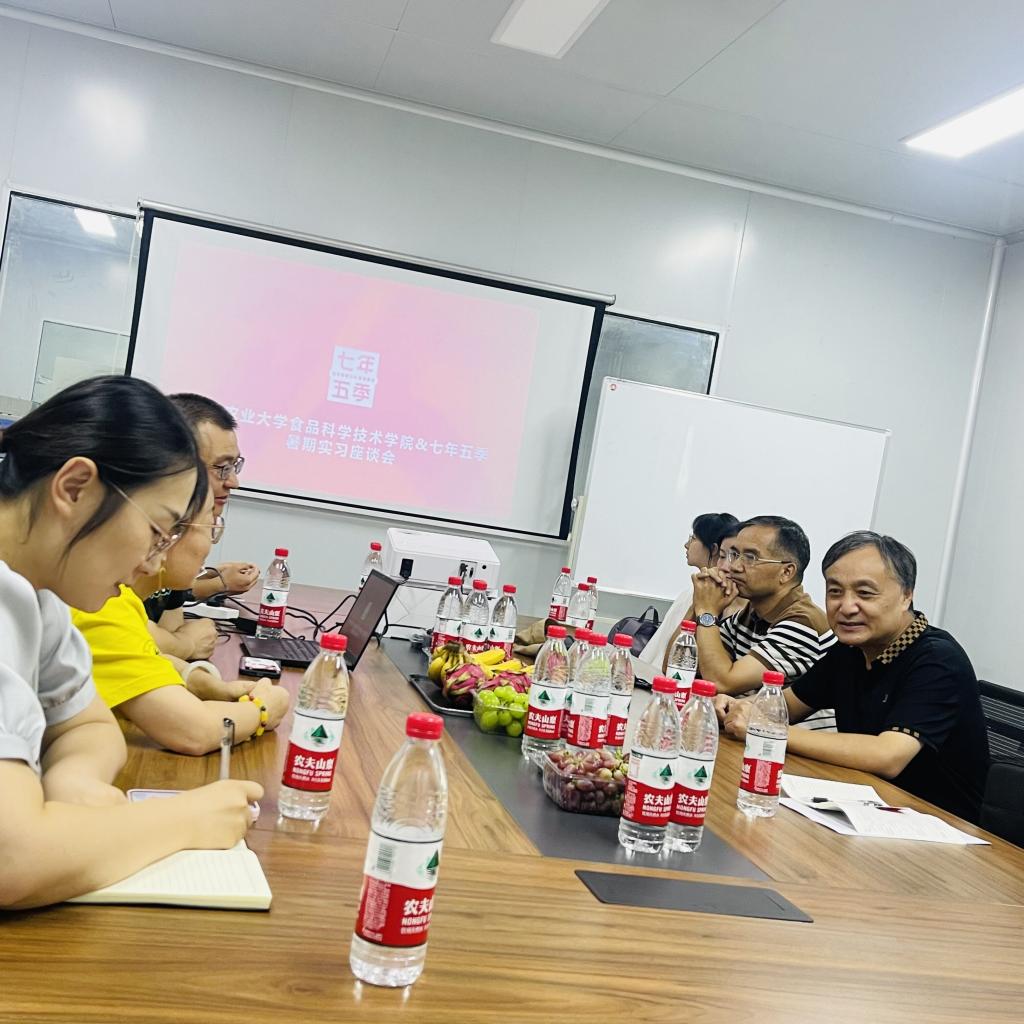 8月16日,学院党委书记杨铁贵一行赴武汉百品味来科技有限公司(七年五季)看望学院本科毕业实习学生。本科生院实践教学管理处处长刘震、学院副院长刘友明,指导老师袁方、胡筱波、吕优优,以及武汉百品味来科技有限公司(七年五季)联合创始人陈俊、研发部负责人王莹莹、技术部负责人陈媚依、生产部负责人姚博共同参加了座谈。