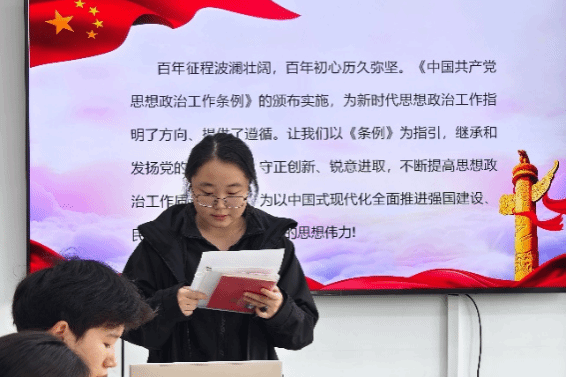 随后,唐可欣同志带领支部成员深入学习《中国共产党思想政治工作条例》。《条例》以习近平新时代中国特色社会主义思想为指引,以党章为根本遵循,全面总结了党领导思想政治工作的历史经验,尤其是新时代思想政治工作的理论和实践成果。唐可欣同志强调,思想政治工作是我们党的优良传统和政治优势,全体党员必须在“学”上下真功夫,筑牢思想根基;在“做”上见真成效,切实解决实际问题,不断提升思想政治工作的质量和水平,提高自身的思想素养。