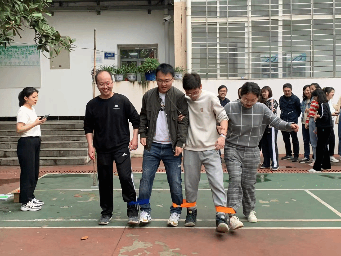 比赛开始前宋蓉老师做的第一件事情就是蹲下系紧鞋带,还一边说道“我可不能给学生拖后腿呀”,计时一开始,大家一齐喊着“一、二、一、二…”,手挽着手,相互配合着彼此的节奏,目光紧紧盯着脚下的每一步,一起迈步向前,一旁观赛的同学们给比赛队伍喊着加油,现场十分热闹。