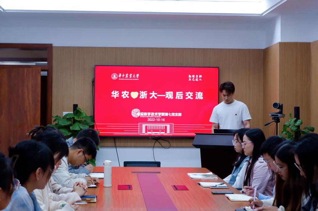浙大支部党员随后展开分享。党员刘诗雨分享到十年来对党和人民事业具有重大现实意义和深远历史意义的三件大事:一是迎来中国共产党成立一百周年,二是中国特色社会主义进入新时代,三是完成脱贫攻坚、全面建成小康社会的历史任务,实现第一个百年奋斗目标。并就自身入党的心路历程、投身抗疫一线的经历展开介绍。党员木森以总书记多次提到的“人民”二字展开交流,“与天下同利者,天下持之;擅天下之利者,天下谋之。”,中国共产党根基在人民、血脉在人民,这是党十年来重大成就的关键,也是今后十年我们持续奋斗的准则。