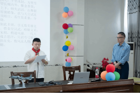 宣讲结束,大营的谭欣玥同学带领全体同学朗读毛泽东主席的经典诗词《沁园春•雪》,“北国风光,千里冰封……”清澈的童声在会议室回荡,同学们沉浸其中,仿佛置身于那个冬日,随着毛爷爷的脚步在高山之巅看祖国千里江山,万里锦绣。“能成为领读员,我很骄傲。”谭欣琪说。