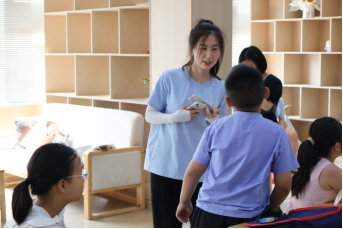 实践团成员姜乐淇与小朋友互动 方佳欣摄