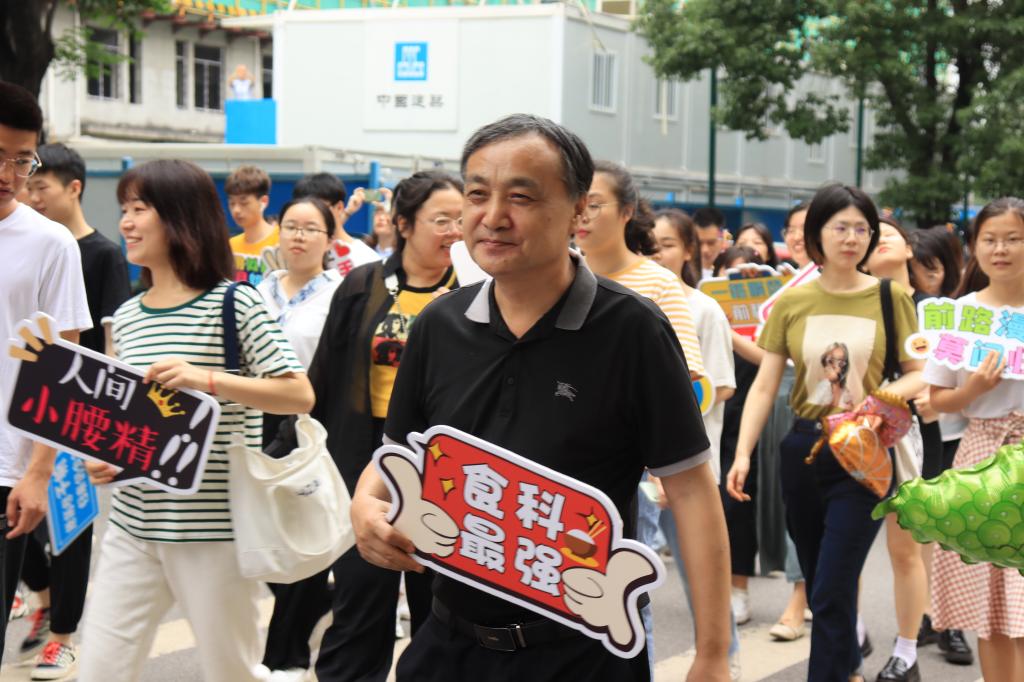 我院机械农机位于五号位置,各类食品图片装点的轮胎、一些诸如“干饭人干饭魂”的醒目标语无一不展现着我院“民以食为天”的特色主题。游行的过程中,杨铁贵书记在最前方引领着大家前行,广大师生挥舞着不同标语的毕业手牌。沿途中也有不少的同学被吸引,纷纷加入队伍参与游行,大家的热情在引擎的轰鸣声和师生的欢呼声中持续高涨。