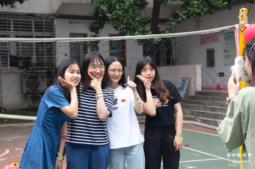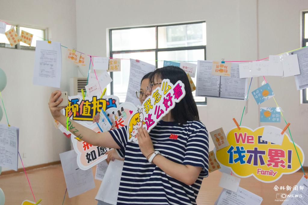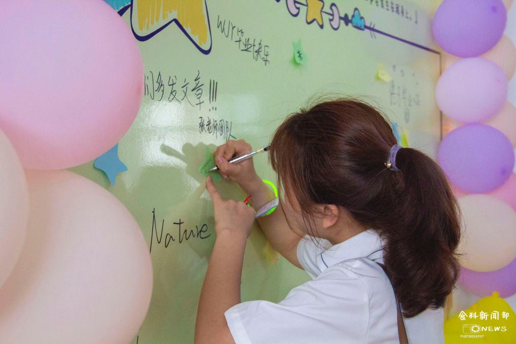 由气球点缀而成的回忆墙旁,有同学举着“主角光环”的牌子,此刻的笑容随着快门的“咔擦”声被永远定格在了胶片上。长廊的左边,幸运转盘处抽中奖品的同学正在欢呼雀跃。