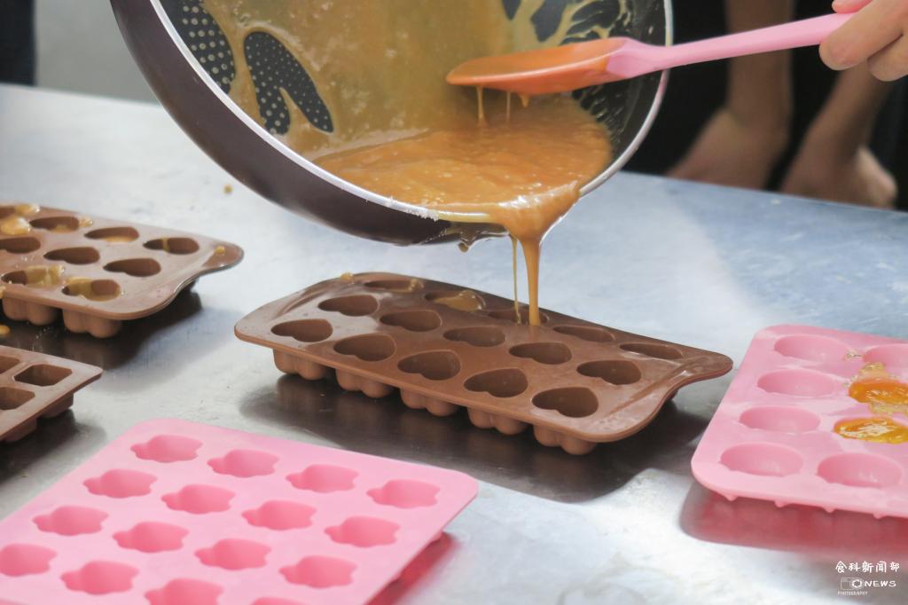 接下来进入糖果制作阶段,侯焘老师先讲解了糖果制作的流程及原理,与同学们共同的完成了称量原料、熬制糖浆、测量温度、铸模等过程,最终制得水果硬糖和太妃糖。