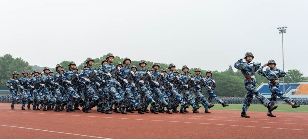 在结业式总指挥、军训师副师长辛古坤下达口令后,标兵就位,分列式开始。54个受阅方队在指挥下依次通过主席台,接受检阅。