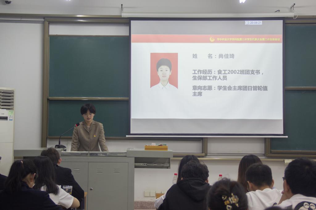 会议伊始,学生会执行主席冯方军代表学生会作《食品科学与技术学院第三十六届学生会工作报告》,轮值主席吉泽阳作《第三次学生代表大会提案工作报告》。随后,全体代表表决通过《第三十七届学生会主席团选举办法(草案)》及《第三十七届学生会主席团候选人建议名单》。