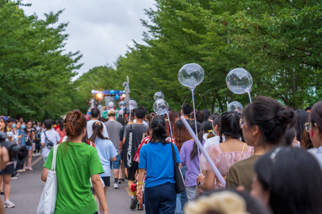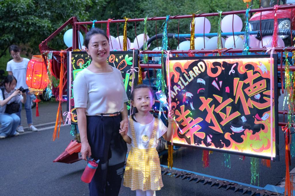 下午六点半,巡游队伍集结完毕,各学院按照“工科基地–荟园主干道–狮子山广场”的路线有序前进。我院的机械农机位于巡游队伍的六号位置,农机前方宽大的装饰牌上分别写着代表食科专业的“Food”和“美拉德”字样;农机的滚轮上装饰着彩色条带、气球和灯笼,红色的车身贴着“调和鼎鼐,知味天下”独属于食科人的标语,车后悬挂着各式蔬菜形状的气球,这辆由我院师生共同装扮的“美拉德”号农机,凸显食科特色,彰显食科风采。农机两旁,我院师生手持五彩气球,头戴荧光环,热情洋溢,活力满满,跟随车辆缓缓前进。