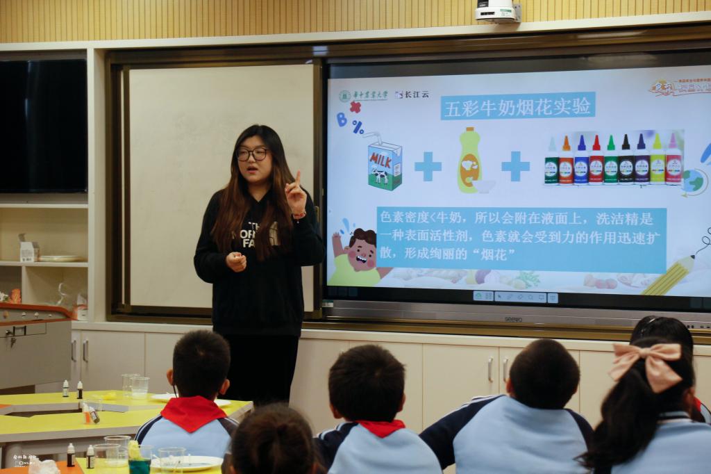 课堂进入了最后的实验环节,最令小朋友们感到震惊的是“五彩牛奶烟花实验”。实验中,同学们先将纸盘铺满一层牛奶,再滴入不同色素,随后将蘸有洗洁精的棉签竖直插入其中,可以看到色素以棉签为圆心形成了一个色素圈,并一直向外扩散。同学们发出疑问,询问老师:“这是为什么呢”,小刘老师就给他们解释了其中的原理。原来,色素的密度小于牛奶,所以滴入的色素会附在牛奶表面,而洗洁精是一种表面活性剂,色素会受到力的作用而迅速扩散,形成绚丽的“烟花”。
