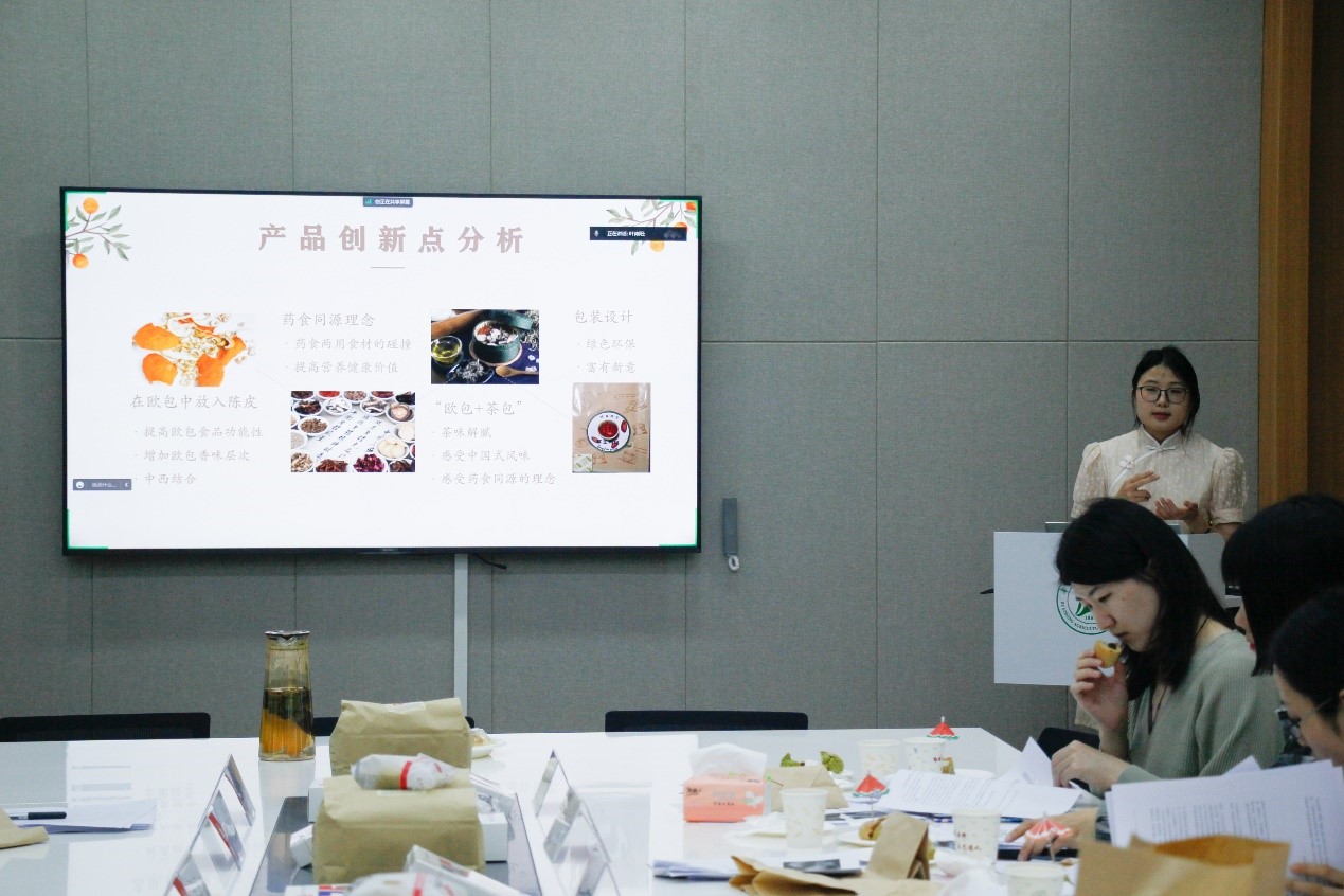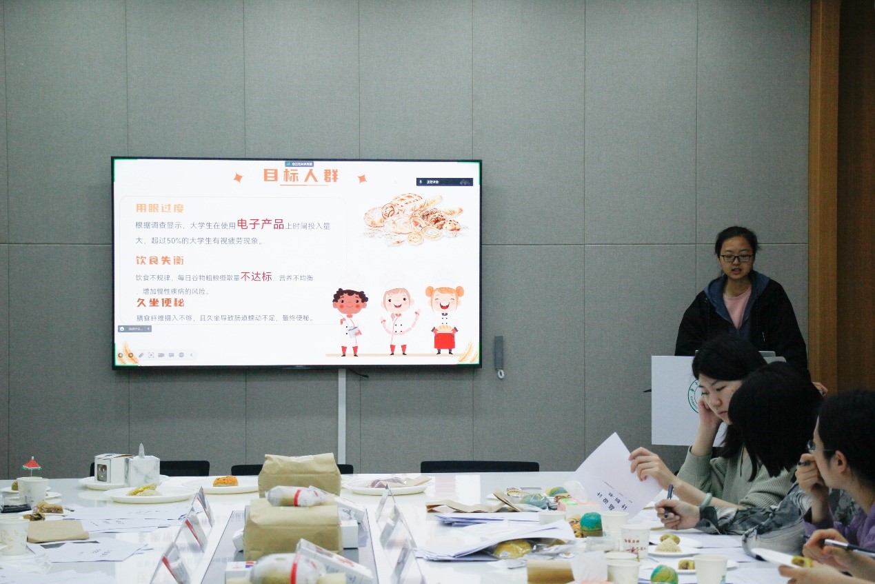 答辩会环节中,各队伍立足产品特色,凸显产品创意,分别从产品立意、创新点、原料选择、生产工艺、市场可行性分析等方面对参赛产品进行全方位阐述。其中“邂逅·春艾系列全麦欧包”和“陈皮主义”两款产品队伍都依据药食同源理念,将中草药艾草、陈皮这两种传统中药材与西式面点相融合,面包中的中国风令人耳目一新;