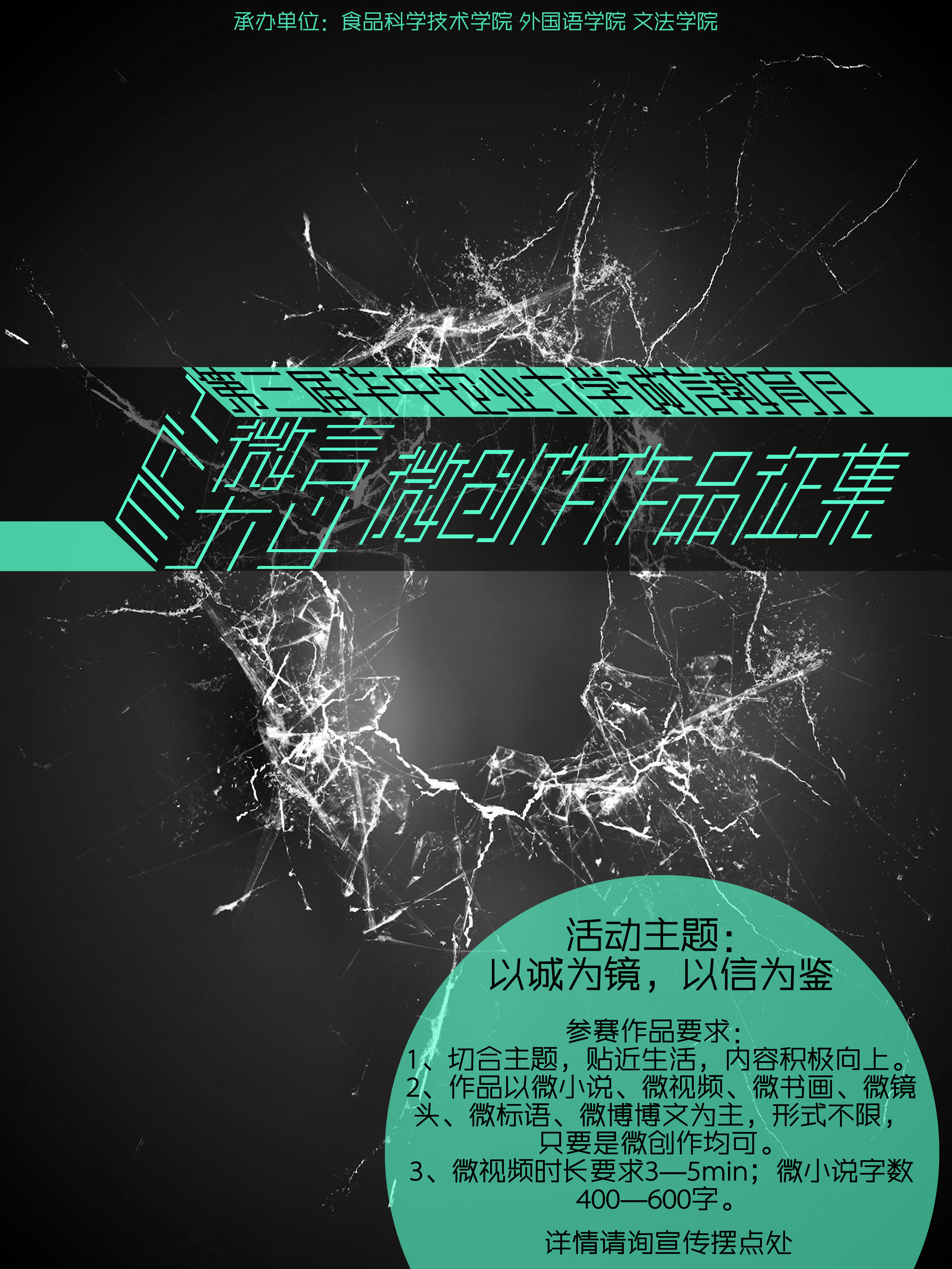 “微言大义”微作品征集令:你还在寻找一个校园平台展现你的才艺吗?让我们成为你的才华与创意的载体吧!我们本次活动的主题为“以诚为镜,以信为鉴”。即日起至5月4日,将你的作品(微小说(400-600字),微镜头,微视频(3-5min),微书画,微标语,微博博文等其他微创作均可)发送到邮箱hnskjz@163.com 或者纸质版作品交至荟四674(陈炎铃同学,手机号13429814217)。另外请在交送作品时附上个人信息(姓名,专业班级,手机号,QQ)。详情请于5月6-14日到荟园主干道咨询。