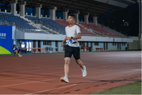 当晚气温偏低,微风裹挟着凉意,却丝毫没浇灭乐家延对10000米长跑的热情与决心。集合、检录、进入跑道,所有流程都在有序推进。放松肌肉、调整呼吸、做好预备姿势,随着开跑信号响起,乐家延迅速进入状态,每一步都踩得稳健。