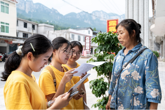汤子婕与志愿者在进行问卷调查