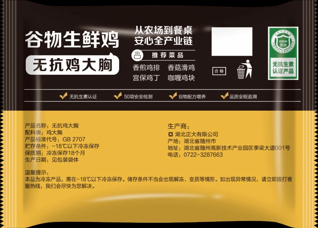 2022年,湖北正大有限公司重磅推出中国原创“无抗鸡”系列产品。该产品全程不使用任何抗生素和激素,真正实现了“零添加”,并已获得“方圆认证”出具的权威性无抗产品认证。