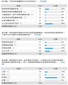 对于居民等人食品安全生活小知识考查中,大部分人可以基本掌握生活中常见的食品安全知识,但人们对于生活中的急救措施和民间谣言还存在着一些误区。像是在生活中被鱼刺卡住,有53%的人选择可以喝食醋进行缓解,但实际上这一措施无任何效果,而正确答案之一“用手指压喉咙”仅仅只有15%的人选择。此外,有高达39%的人依然认为“吃鱼目能明眼”这一民间谣言是正确的。相比较,人们对于食用油的存放及购买这一问题的了解程度掌握良好。