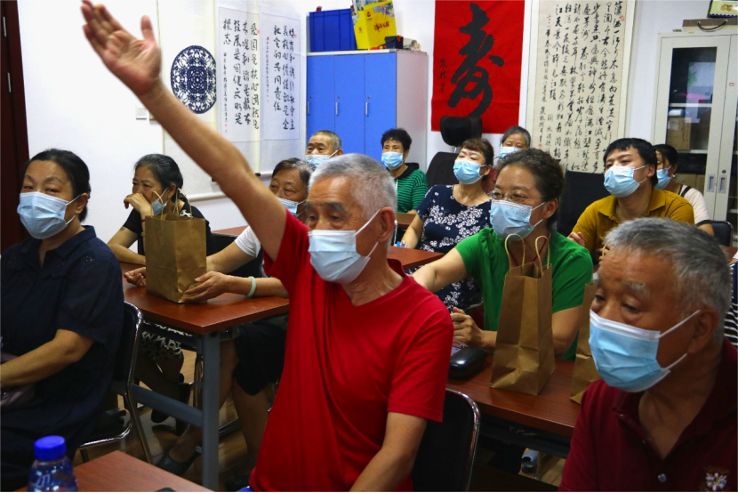 科普讲堂结束后,主持人李琪琪根据讲解的内容与老人们开展互动问答。冰箱里的蔬菜应该如何摆放?常见食品应该如何保存?老人们积极回答,分享自己的生活经验。宣讲结束后,博士团为老人们分发了礼品。
