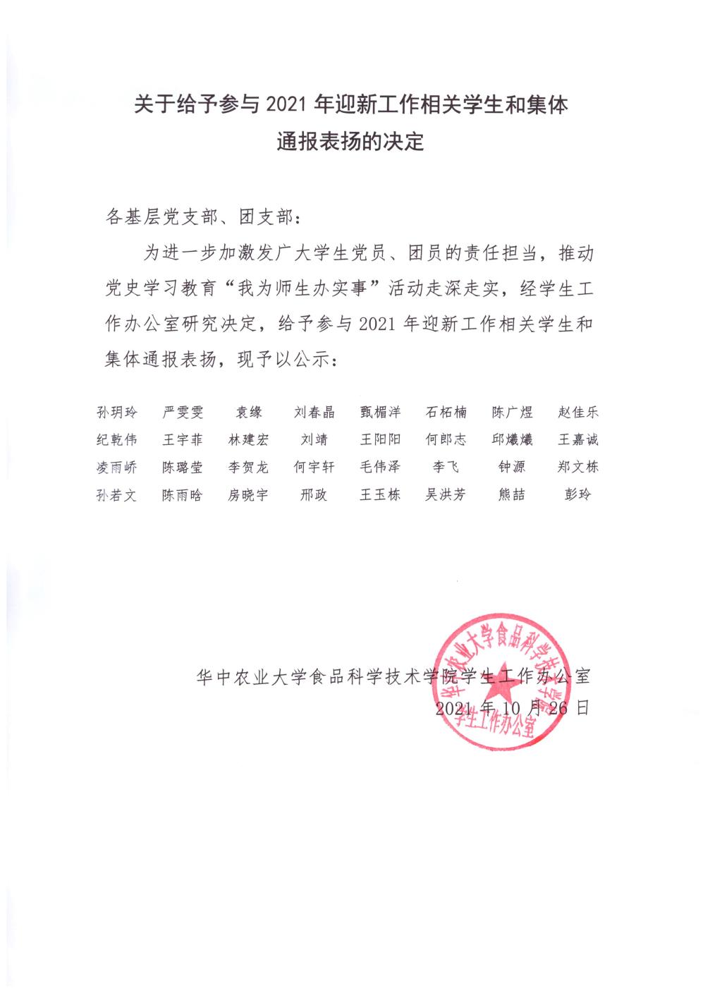 关于给予参与2021年迎新工作相关学生和集体通报表扬的决定