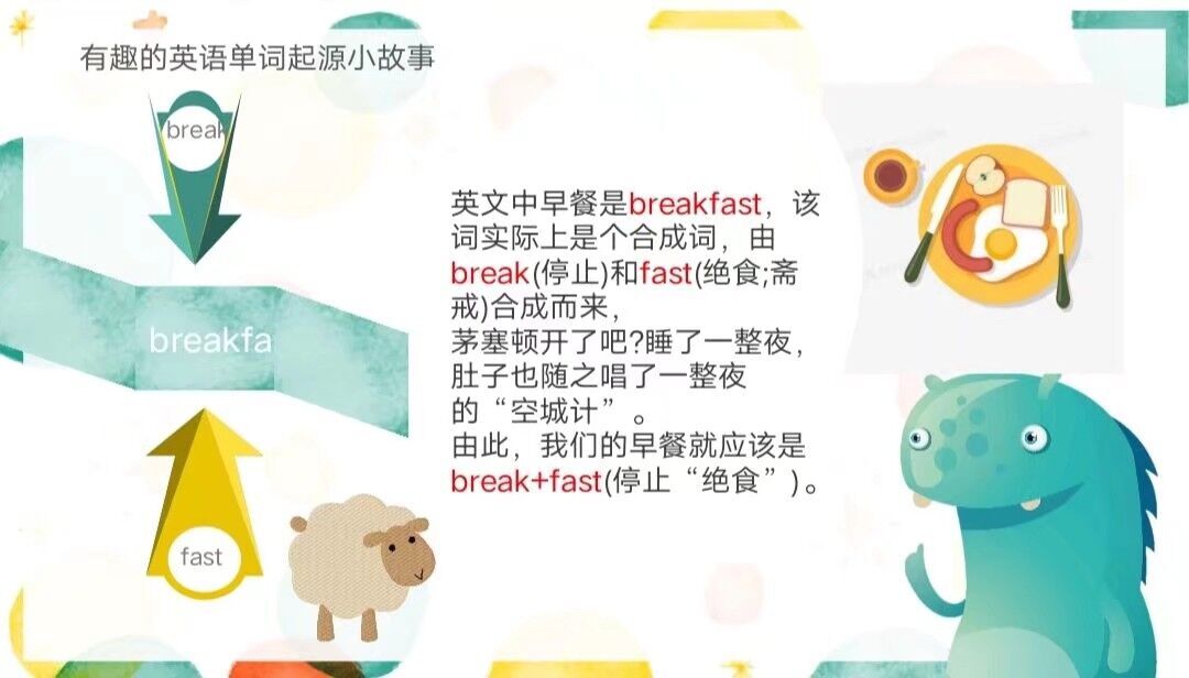 接下来,主讲人讲解了有趣的英语单词组成知识。比如单词“breakfast[早餐]”,它是由“break(停止)”和“fast(绝食;斋戒)”组成而成的,睡了一夜之后肚子的“空城计”的有趣解释激起了小朋友的兴趣。此外,还介绍了 “hot potato[棘手的问题]” 等英语俗语产生的背景。这些在平常学习中不常接触到的有趣小知识,更增加了大家的兴致。