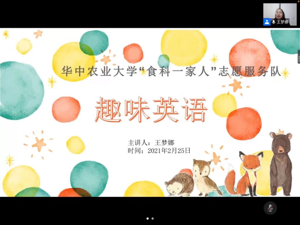随着国际全球化发展,英语作为主要的国际通用语言,在我们的学习和生活中显得越来越重要。2月25日晚,由我校“食科一家人”志愿服务队主办,洪山区金鹤园社区协办的“趣味英语”活动举行,此次活动由志愿者王梦娜主讲,旨在通过介绍英语历史背景以及讲解趣味知识点来培养小朋友对英语学习的兴趣。